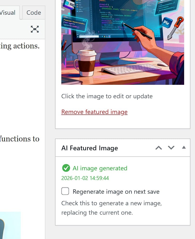 What if I don't like a generated image? Click "Regenerate" in the post editor, or upload your own image manually.