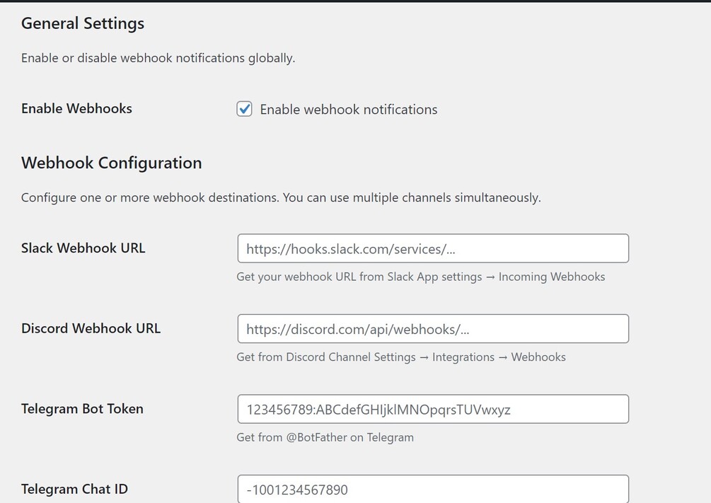 - Add your webhook URLs (Slack, Discord, Telegram, or custom)